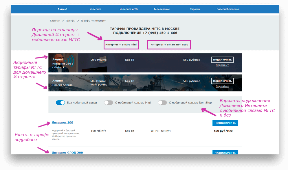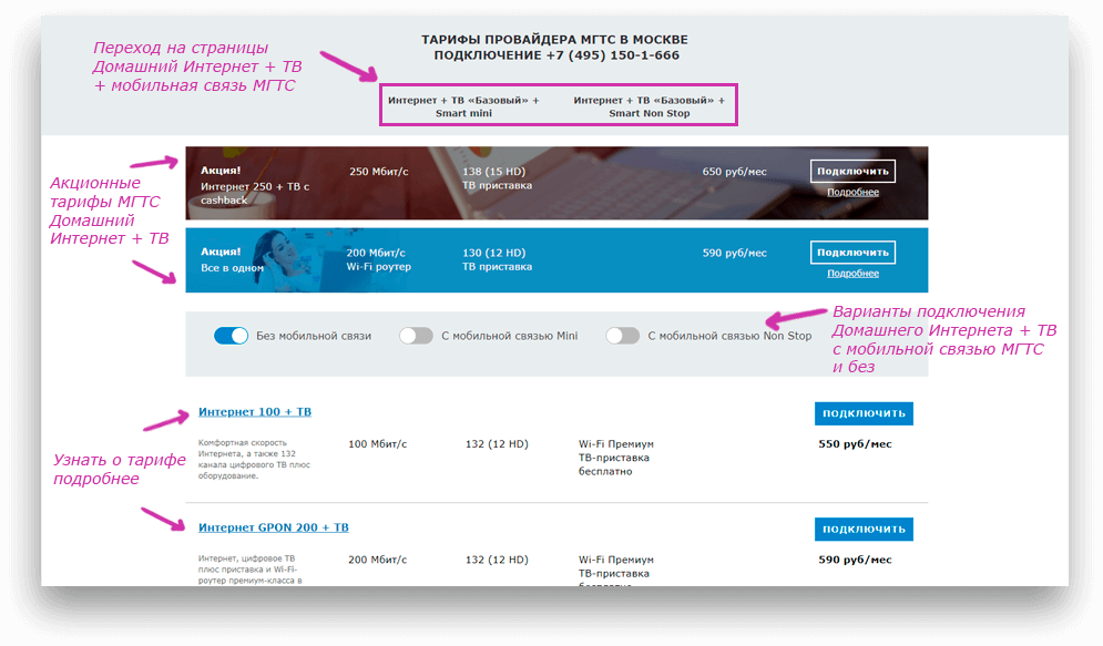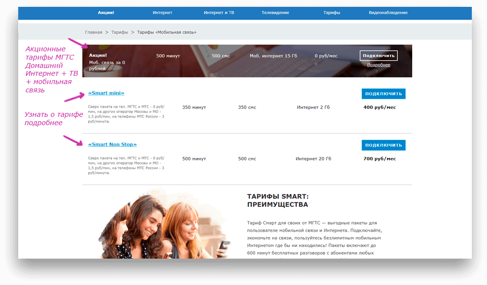 Провайдер даёт возможность подключать Интернет вместе с мобильной связью. В этом случае в комплекте с доступом в Сеть клиент получает в своё распоряжение один из мобильных пакетов МТС – Smart Mini или Smart Non Stop. Причём тарифный план устроен таким образом, что абоненту звонки по телефону не будут стоить ничего. Детальнее об условиях пользования подобным тарифом вы можете узнать на соответствующей странице сайта.