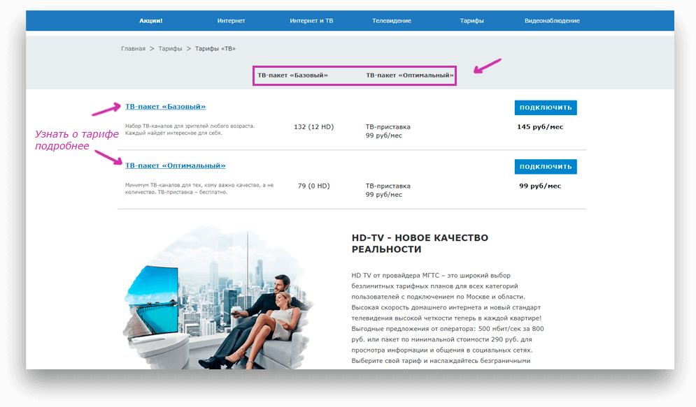 Абонентам, желающим подключить только цифровое телевидение, провайдер предлагает перейти на соответствующую страницу сайта, где они смогут ознакомиться с предлагаемыми тарифами.