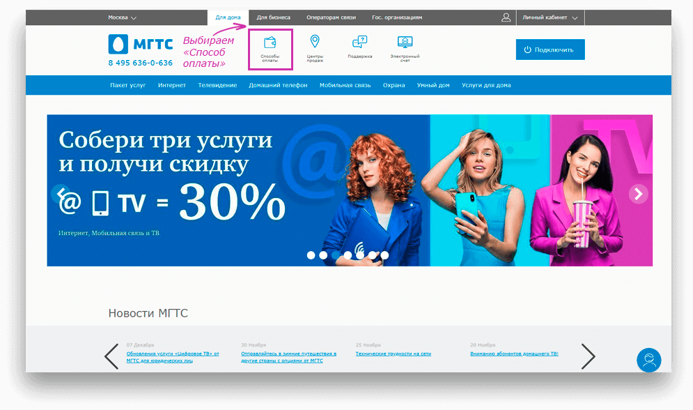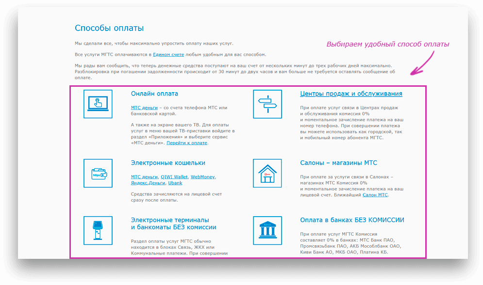 Оплачивать услуги абоненты МТС могут самыми различными способами. Для ознакомления с их перечнем, а также для выбора подходящего варианта достаточно нажать кнопку «Способы оплаты», находящуюся в верхней части сайта по соседству с логотипом компании.