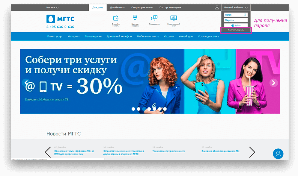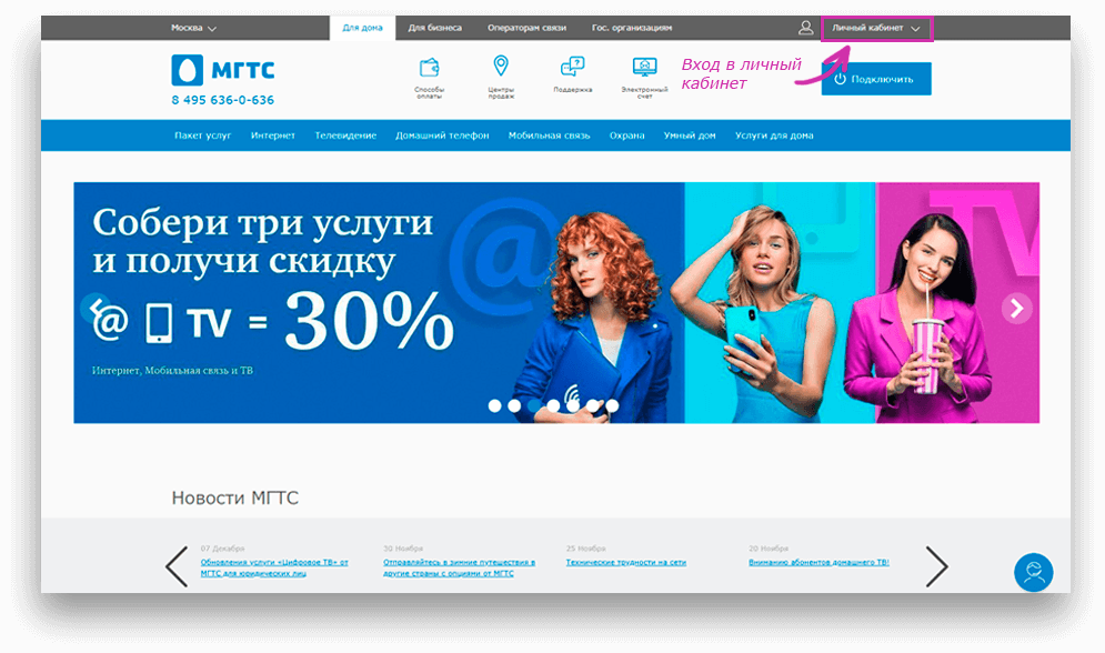 Войти на сайт провайдера вы можете, используя любой браузер. Для этого следует набрать в адресной строке mgts.ru. Для входа в личный кабинет нужно нажать на кнопку «Личный кабинет», расположенную справа в верхней части сайта.