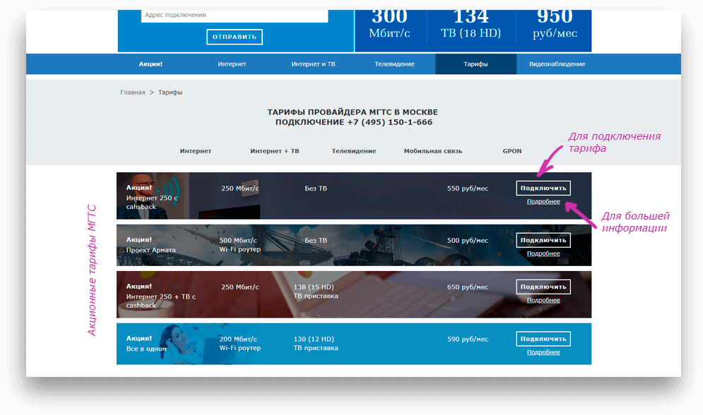 Провайдер регулярно устраивает для своих действующих и потенциальных клиентов различного рода акции, в которых предлагает им тарифные планы с более выгодными условиями, чем в стандартных тарифах. После нажатия на кнопку «Акции» вы попадаете на страницу с описанием акционных предложений МТС, которые действуют в настоящий момент. Здесь же можно ознакомиться с их подробным описанием, а также подключить понравившийся акционный тариф.